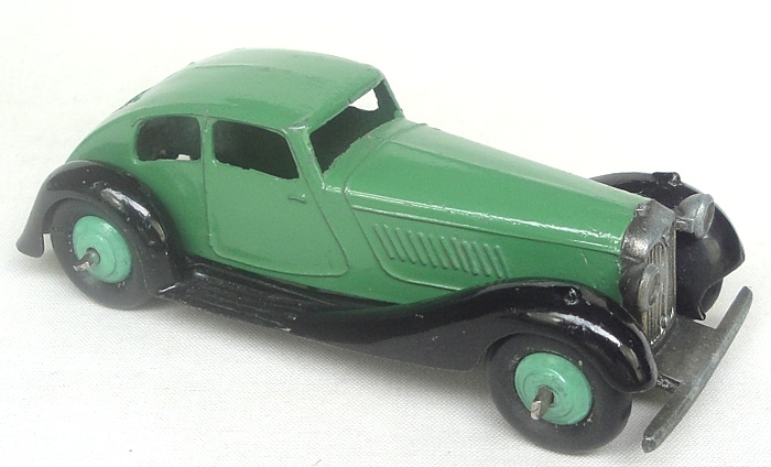 This classic model is a scarce export version in distinctive mid-green with black wings, light green ridged wheels and closed detailed chassis. Intact and complete radiator, headlight and bumper assembly.