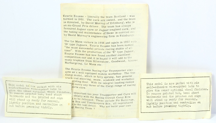 Lift-off Lid Box is attractive with bright clean colours. Minor edge rubs and a little light marking/light wear besides. Comes complete with the original inner packing and three related Leaflets, as well as another Corgi Club Membership Form.