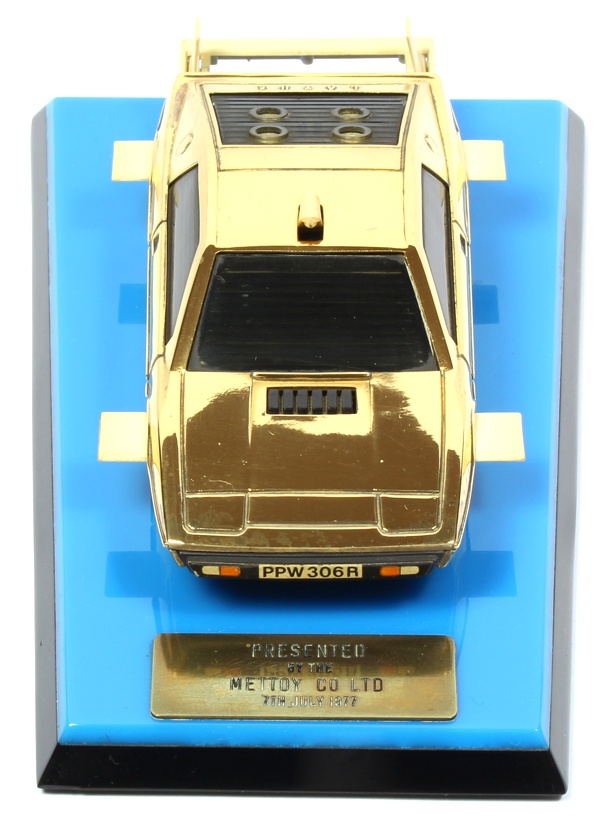 Just 10 14 Carat gold-plated Lotus Esprit models were made. The first model was presented to Princess Anne at the premiere of the James Bond film ‘The Spy Who Loved Me’. Others were presented to Cubby Broccoli (director of the film), and other personalities at the Playboy Club after the premiere. One example was presented to Roger Moore which he signed – and this is it!