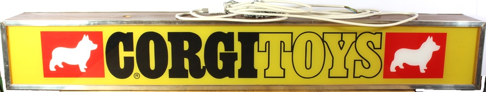 A memorable, original point of sale/period toy show piece from the late 1960’s – this large illuminated sign composed of plywood with colourful perspex panels and chrome effect strip border, can be suspended from the sturdy metal chain. Measures approx. 123cms long, 18cms. high and 15 cms wide. A little minor age wear at one short end.