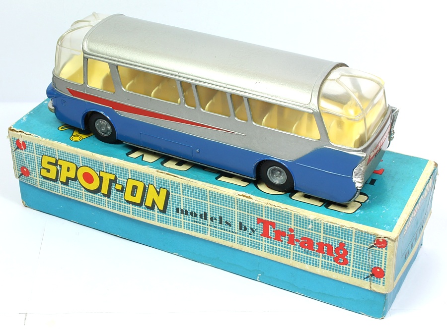 Issued during 1960 by the respected Spot-on manufacturer in strictly 1:42 scale. This fine coach is in near mint condition with a little light marking, mostly at wheel arches and a coupe of light chrome rubs.. Complete ‘Tri-ang Tours’ transfer. Cast wheels. Fine original tyres. Suspension is intact on all four wheels. Number plate at the rear.