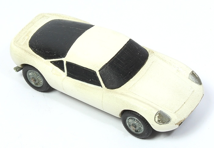 Sadly, this model never went into production, so this nicely-detailed wooden prototype is all that remains of this exciting Ghia Vallelunga model. White and black painted wooden prototype with silver trim and free-running detailed cast wheels. Looks like the removable chassis, as on the Corgi Lotus Elan. Minor age wear only. Approx. 9 cms in length.