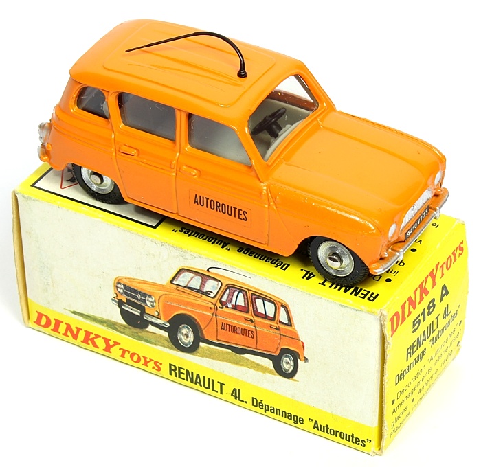 French Dinky 518A Renault 4L 'Autoroutes'. Very near mint/boxed. With aerial and number-plates applied. Additional (but not correct for this model) still-sealed pack of number plates and Road Sign. From The Reference Collection.