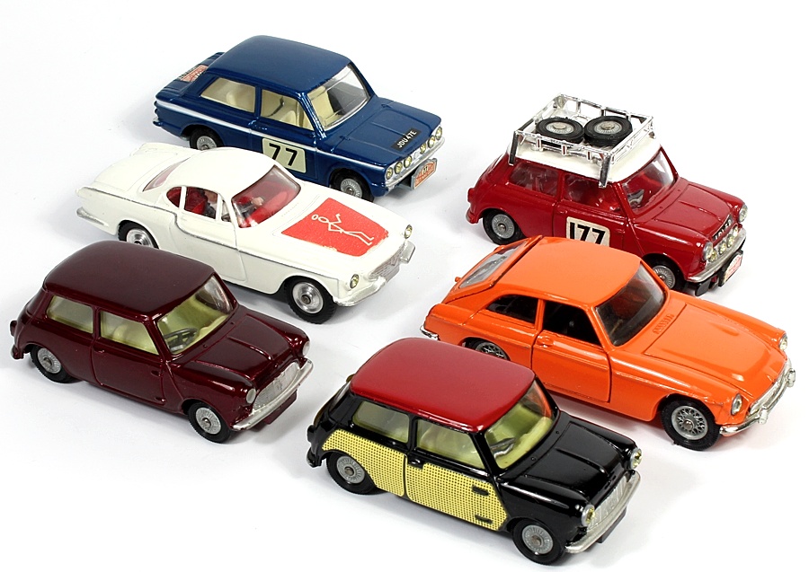 5) Corgi 249 Morris Mini Cooper De-Luxe in black with a red roof and complete ‘wickerwork’ side panels (minor wear at one side). Suspension on detailed cast wheels. Very near mint.