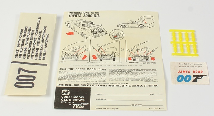 Corgi 336 James Bond Toyota 2000GT. Very near mint/boxed. With full Secret Instruction Packet, card ring and wrap-around card packing. Superb outer box & plinth. From The New European Collection.