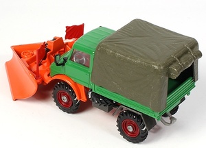 Issued between 1971-77, this chunky little Mercedes 406 model is fitted with a bright orange snow plough and two red flags. Deep green cab, red interior, orange chassis and textured olive green canopy. Deep red cast wheels and as-new tyres.