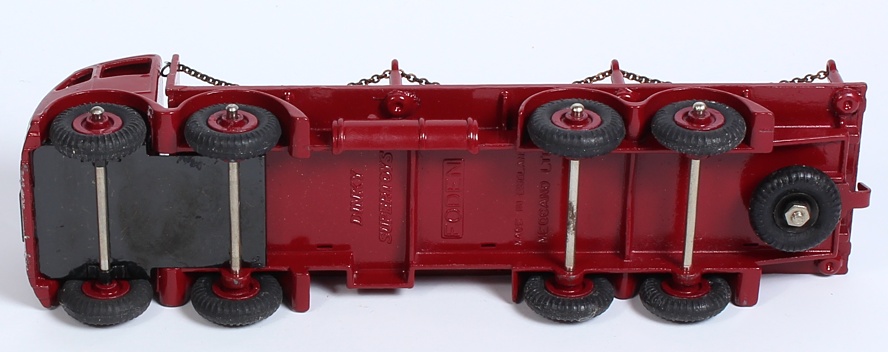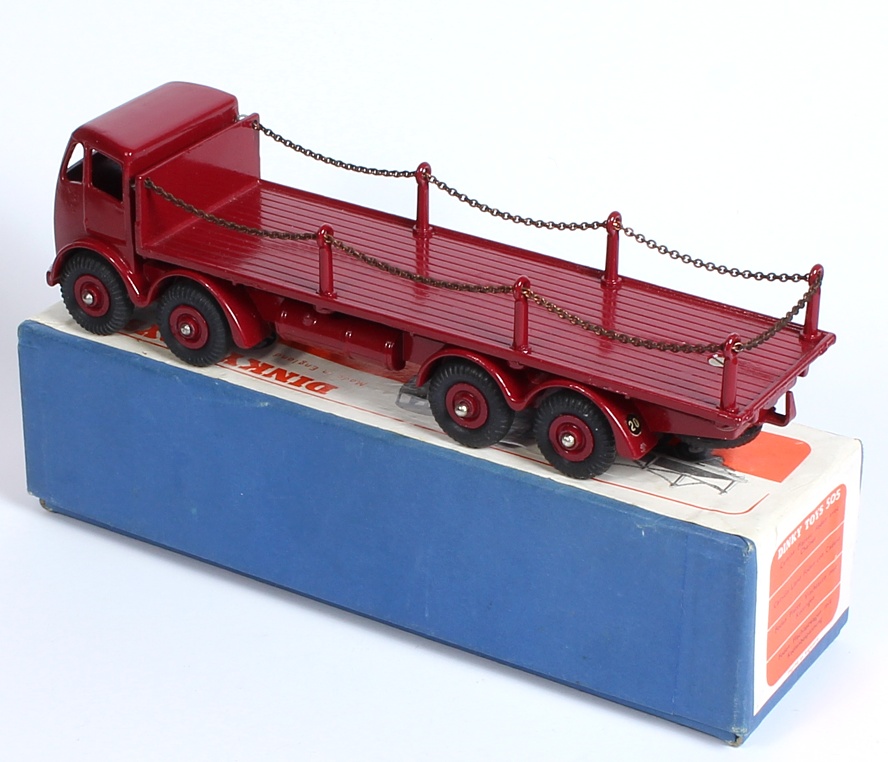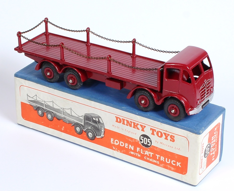 Dinky 505 Foden Flat Truck with Chains. Maroon 2nd type model. Near mint plus/boxed. Scarce 1ST TYPE BOX. From a small 'single owner from new' collection.