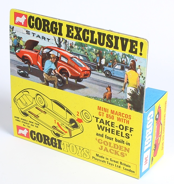 3) Corgi 341 Mini Marcos GT850. Maroon. Never removed from its box, so assumed mint/boxed. (Very small tear emanating from an end flap). Happily free of the usual crease at header card reverse where it joins the main body of the box.