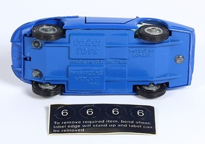 Issued during 1966-69, this model has opening doors and bonnet which reveals a detailed engine. Detailed spoked wheels, a moulded interior which is very pale blue, and as-new tyres with ‘Corgi Toys’ embossed. Under strong light, very faint marks on the boot area may be seen . Few mere dots at the rear edge.