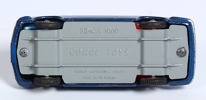 Issued during 1964-66, this Simca model is a rare find (more usually found with a chrome finish). Attractive deep metallic blue finish with racing stripe and number (nick to the bonnet transfer and a few tiny edge nibbles to the other transfers). Vivid red detailed interior. Suspension on bright shaped spun wheels. Fine original treaded tyres.
