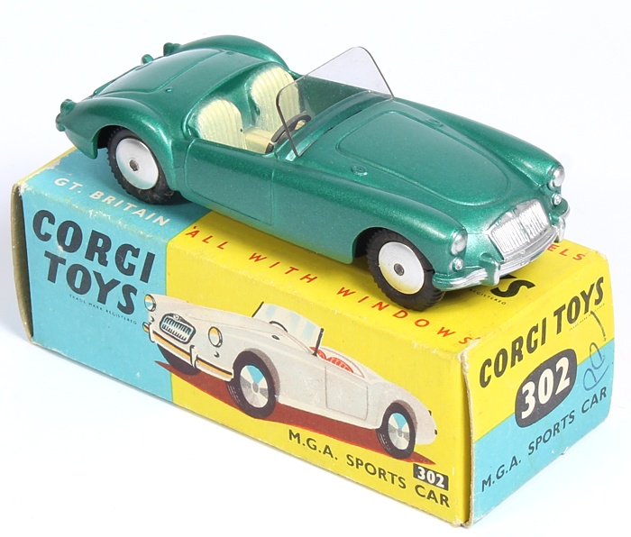 Corgi 302 M.G.A. Sports Car. Near mint plus/boxed. Metallic green version, flat spun wheels. Scarce. From The 25 Year Collection.