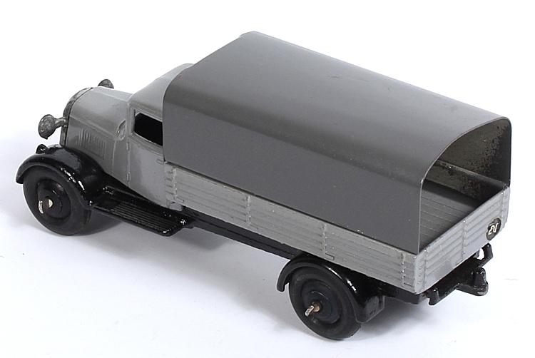 Rare to come to the market place, this Type 4 version was issued 1947-50. Type 2 issue with smooth wheels, well-shaped original smooth tyres and thick axles. Finished in original mid-grey with a black chassis, intact radiator and headlight assembly. Deeper grey tin tilt. Intact tow hook. Moulded chassis.