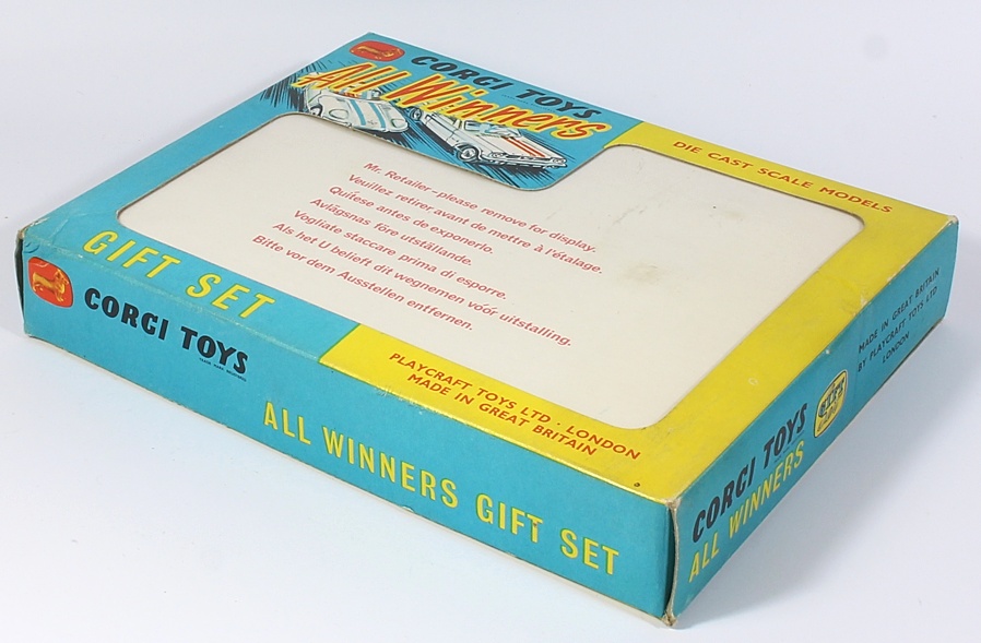 Corgi Gift Set 46 All Winners Set. Very near mint - very, very near mint/boxed, with Retailer Card. Includes still-sealed pack of traffic cones, sheet of racing numbers, 2 hay bales and Corgi Club Membership Form. Scarce and desirable set from an old shop stock find in Yorkshire. See relevant section on FAQ for details on "Offers Invited' - QDT guide £600+