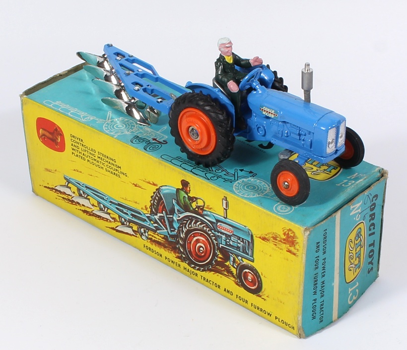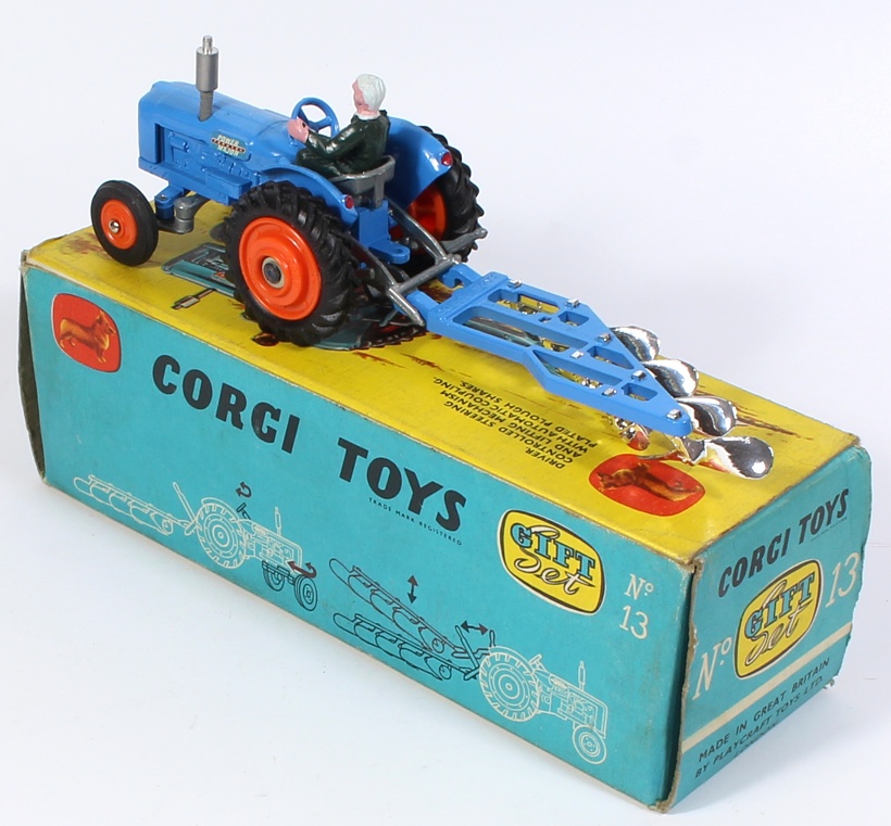 Corgi Gift Set 13 Fordson Power Major Tractor & Four Furrow Plough. Very near mint/boxed (wear) with card packing & Instruction Leaflet. From an old shop store find in Yorkshire.