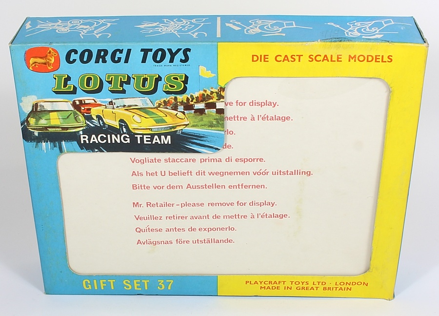 Corgi Gift Set 37 Lotus Racing Team Set. Very near mint - very, very near mint, with accessories/boxed, with Retailer Card. From an old shop stock find in Yorkshire.