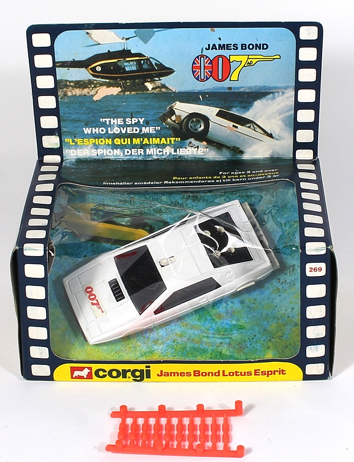 Corgi 269 James Bond Lotus Esprit. Very, very near mint/boxed, with full sprue of missiles. Version WITHOUT the 'New' tag on the box & WITHOUT Hammer & Sickle detail. From an old shop stock find in Yorkshire.