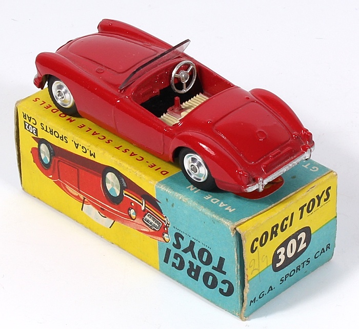 Corgi 302 M.G.A. Sports Car. Very near mint/boxed. Vibrant red version with shaped spun wheels. From The Berlin Collection.