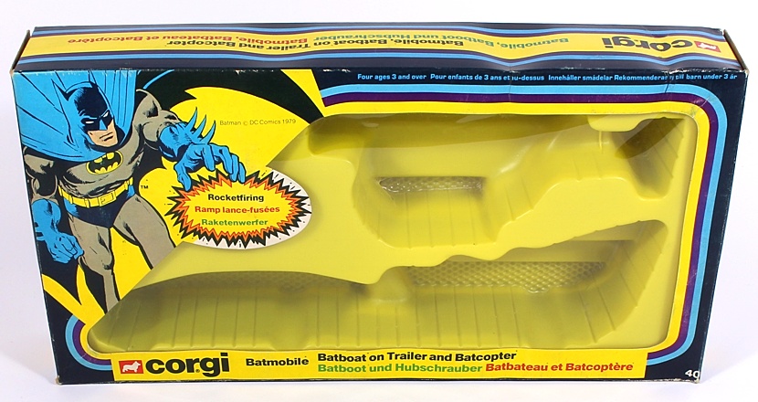 3) 107 Batboat. Late plastic fin issue with chrome dashboard and blue-tinted screens. Bright paper labels are complete Gold trailer with whizzwheels. Mint.