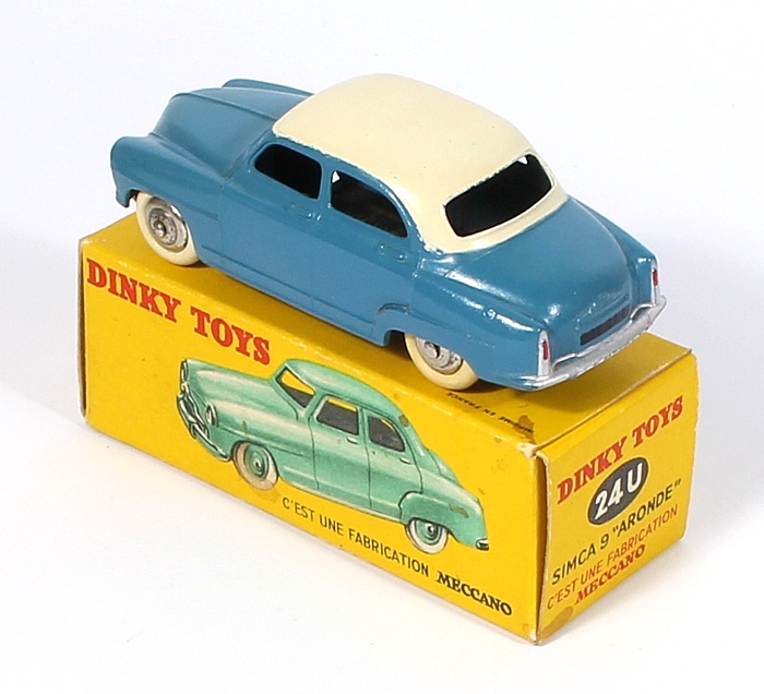 French Dinky 24U Simca 9 "Aronde". Scarce issue in mid blue, white roof. Scarce type 2 issue. Near mint plus/boxed. From a carefully hand-picked selection of models in The Netherlands.