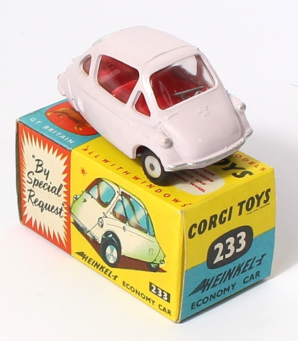 Corgi 233 Heinkel Economy Car. Scarce in pale lilac. Very, very near mint /boxed. Really fresh box. From The 25 Year Collection.
