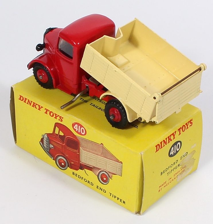 Dinky 410 Bedford End Tipper. Near mint plus/boxed. Red and cream issue, red cast wheels, window glazing. Transition issue. Scarce model from The HNC Collection.
