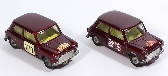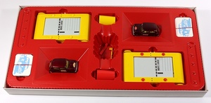 Later than the Fernel Corgi Rallye Monte Carlo Set. This complete and unused set comprises 2 x Corgi 226 Morris Mini Minor in deep metallic maroon. Adapted for this game, so each model has the requisite hole in the base and game-specific labels ( one has Monte Carlo Rally labels, the other has ‘Tulpen Rally’, Holland labels). The labels are complete on both cars, although note that the paint has chipping and there are scratches to the rear windscreen on the Tulpen Rally model. Both have detailed cast wheels and well-shaped original tyres.