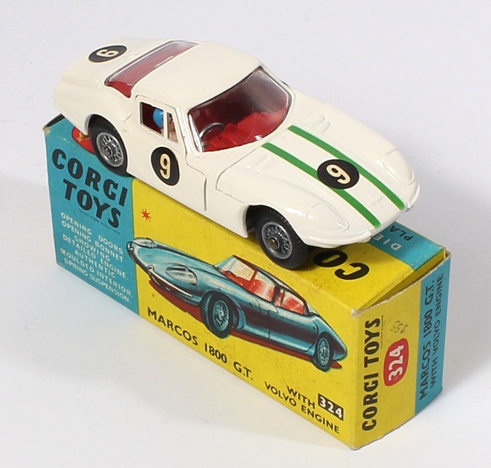 Corgi 324 Marcos 1800 G.T. with Volvo engine. Rare find with MID-GREEN STRIPES. Very near mint/boxed. With applied racing numbers. Another first for QDT! From The M.P. Collection in Switzerland.