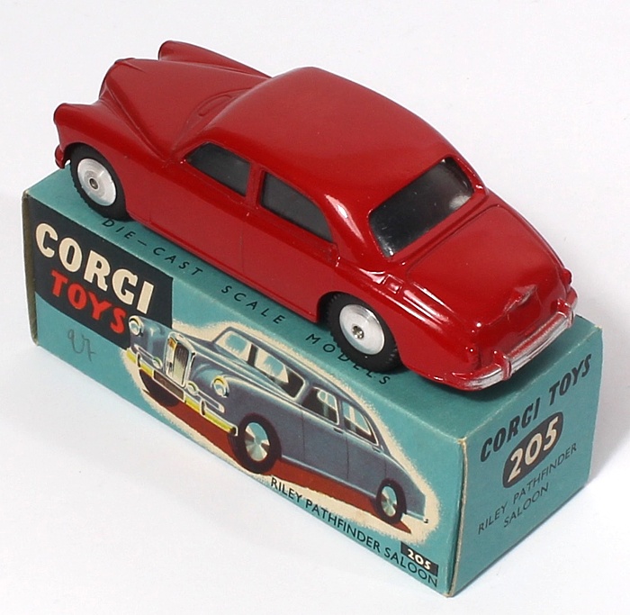 Corgi 205 Riley Pathfinder Saloon. Near mint plus/boxed. Deep red version, flat spun wheels. Very nice box with PINK COrgi Club Membership Form. From The Berlin Collection.