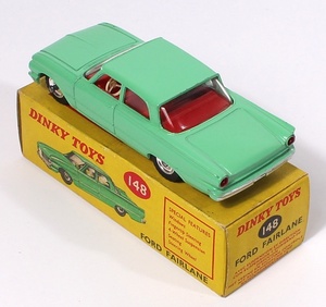 Dinky 148 Ford Fairlane. Near mint plus/boxed. Scarce issue in pea green with a RED INTERIOR, shaped spun wheels.