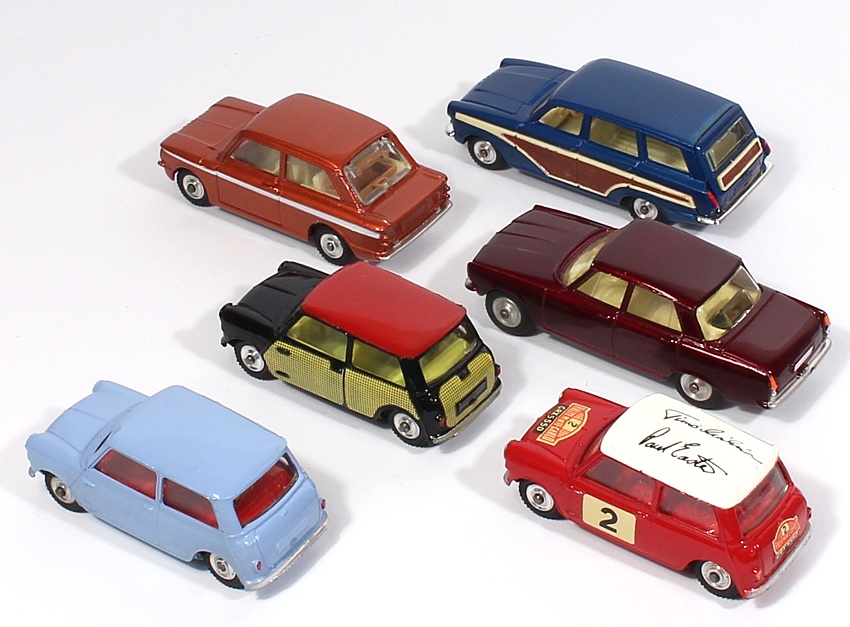 5) Corgi 249 Morris Mini Cooper De-Luxe in black with a red roof and complete ‘wickerwork’ side and rear panels. Suspension on shaped spun wheels, jewelled headlights. Very, very near mint.