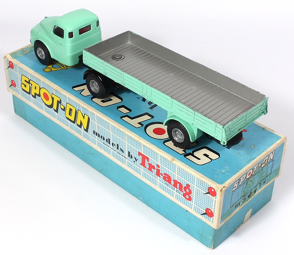 An impressive Spot-on model from 1960 comprising an Austin Articulated Flat Float with Sides in light green, silver and black. In very close to mint condition save for the coupling area (inevitable wear to the paint loss as metal slides over metal).