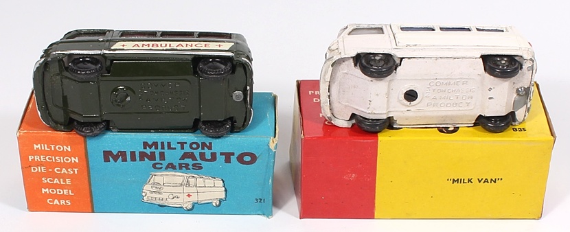 2) White with complete red cross label on the roof and one-piece black plastic wheels & tyres. Window glazing (deep blue at the sides )and an off-white interior. Silver trim. Rather rough cast in places. Housed in a red and yellow Commer Milk Van card box.