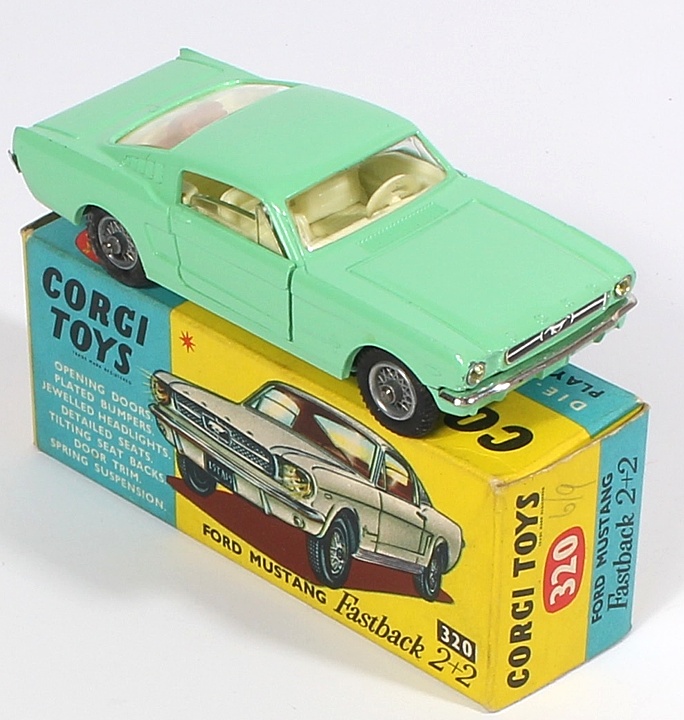 Corgi 320 Ford Mustang Fastback 2+2. Very, very near mint/boxed. Light green version with spoked wheels. From The MBU Collection.