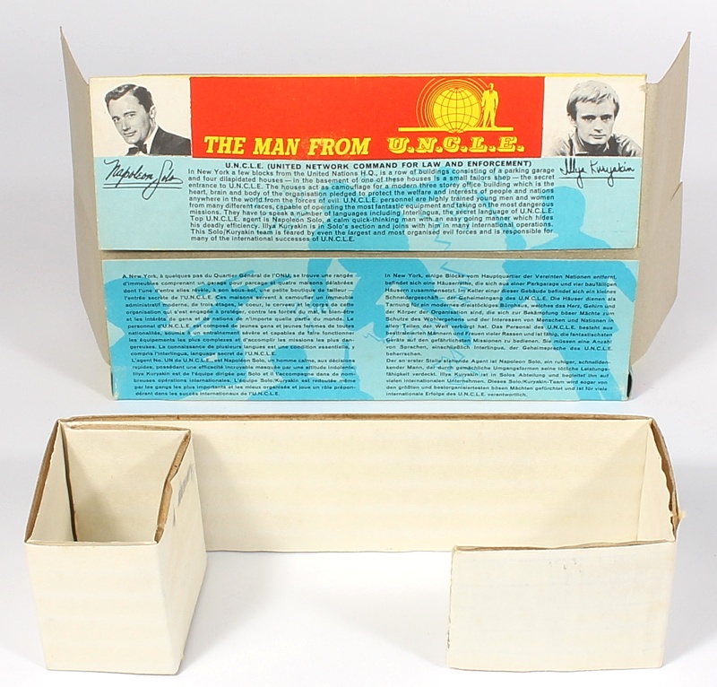 Lots of information on the UNITED NETWORK COMMAND FOR LAW AND ENFORCEMENT (U.N.C.L.E.) on box plinth reverse: