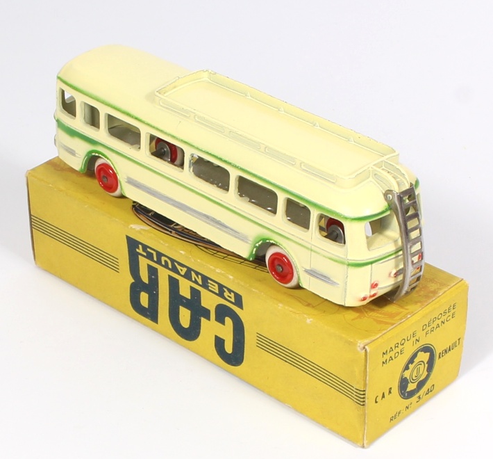 A delightful item from the respected French toymakers CIJ. This Renault Coach has a most pleasing fresh and original cream and green finish with a bright silver ladder at the rear. Red plastic wheels,