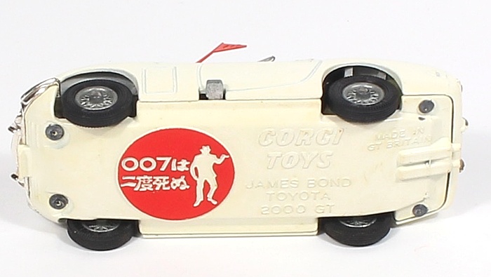 Inspired by the James Bond film “You Only Live Twice”, this Toyota model was made during 1967-69. Displays very well with both figures present, intact aerial, jewelled front and rear lights, complete registration numbers at front and rear, and wire wheels. Suspension is fine.