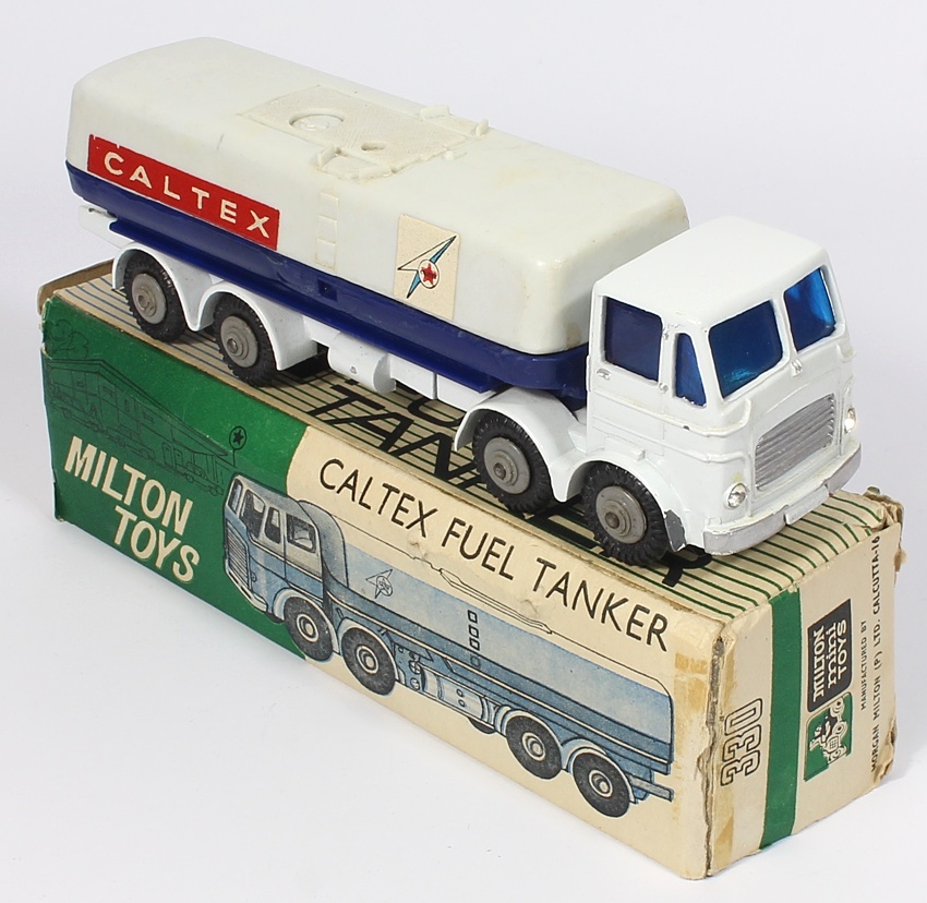 Plastic tanker in deep blue and white has complete ’CALTEX" labels and logo on both sides as well as circular CALTEX logo at the rear. Intact tow hook. Jewelled headlights. Screwed base. Light wear and a flake of paint at a front wheel arch.