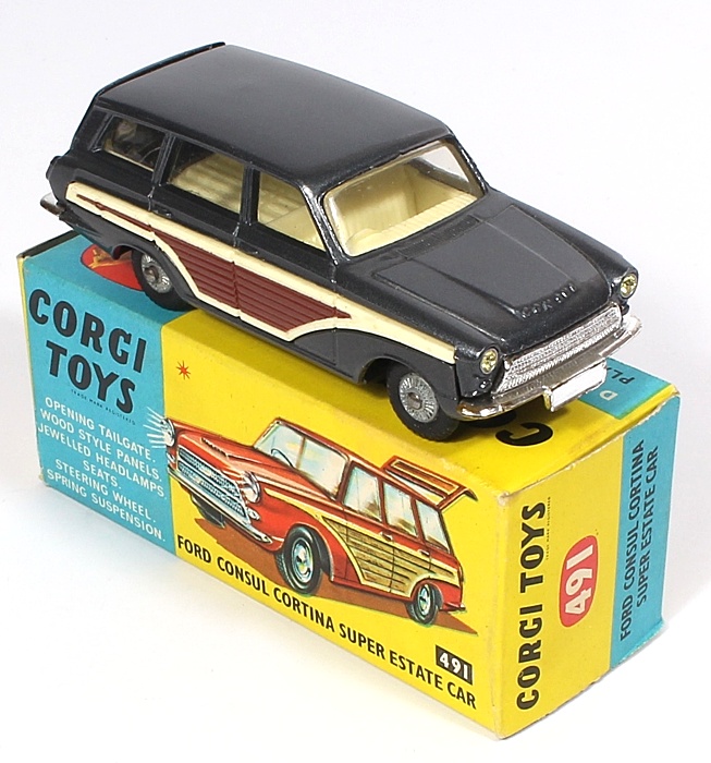 Corgi 491 Ford Consul Cortina Super Estate Car. Near mint plus/boxed. Graphite grey issue. First we have ever offered for sale with CAST WHEELS. Scarce variant from The West London Collection.