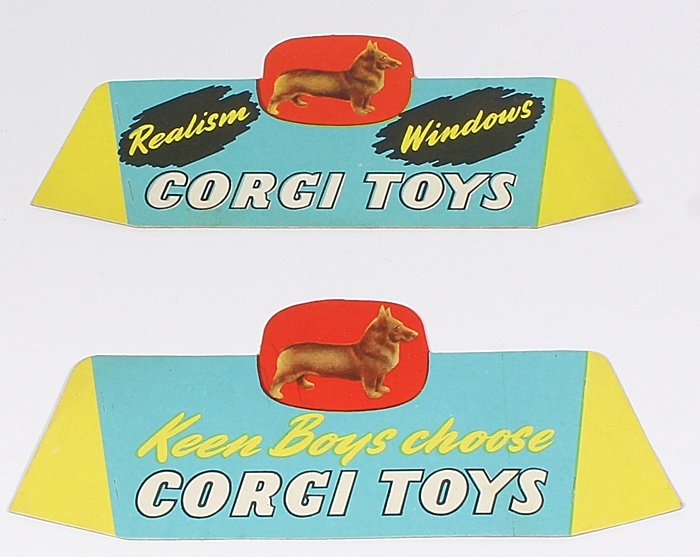 2 x Small promotional Card Stands 'Keen Boys choose Corgi Toys' & 'REALISM WINDOWS'. Very near mint- mint. Scarce. From The MBU Collection.