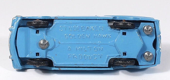 Using the casting from Corgi 211 Studebaker Golden Hawk, this is the Milton version – in an intense mid-blue, with silver trim. Window glazing, white interior and a rather ‘ghostly’ driver. One-piece black plastic wheels/tyres. Sturdy rivets on the base!