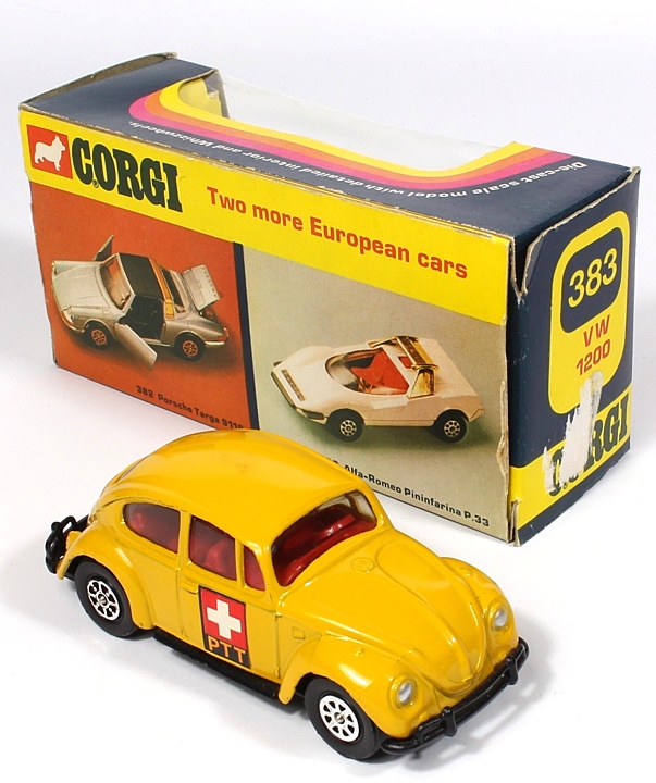 Corgi 383 Volkswagen 1200 . Scarce Swiss 'PTT" issue in yellow with black base. Very, very near mint/boxed. From The West London Collection.