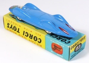 Corgi 153A Proteus Campbell Bluebird Record Car. Very, very near mint/boxed. Second issue, with metal wheels and UK/US flags. In RARE OVER-STAMPED 153 TRANSITION BOX. From The Berlin Collection.