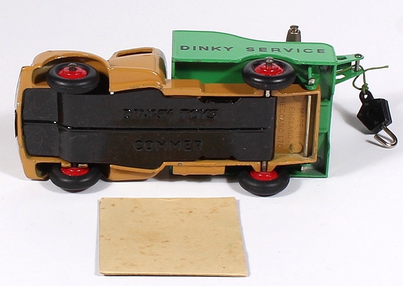 This version has a light tan cab, mid-green back, red hubs, black lettering, well-shaped smooth black tyres. An unplayed with example in very close to mint condition, complete with a working tow hook. Perfect ‘DINKY SERVICE’ lettering in black on both sides, brass winding handle and minor ‘spidering’ on the baseplate.