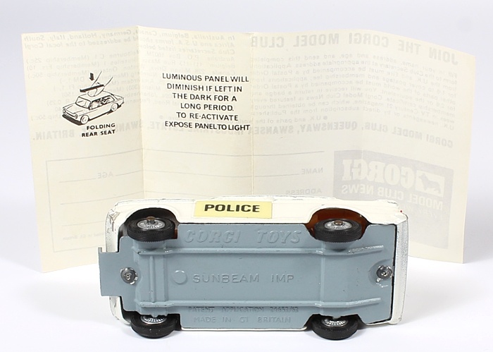 This Sunbeam Imp model has a white body, black roof and luminous POLICE labels on both doors. Dark blue roof light, detailed cast wheels with suspension, brown interior, opening rear window, Police driver, tilting seats, jewelled headlights. ‘POLICE’ label at the front bumper has a portion missing.