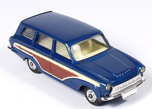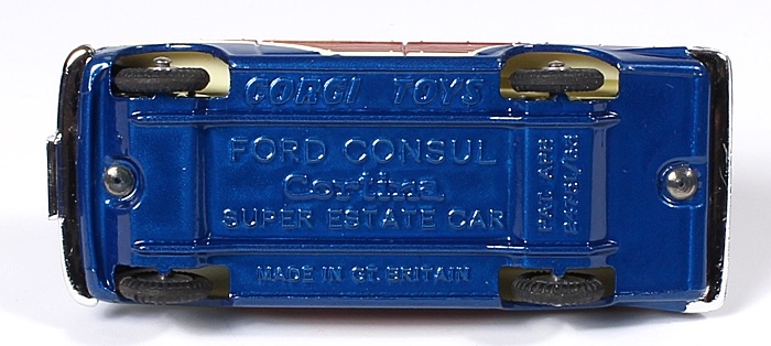 1) Corgi 491 Ford Consul Super Estate Car with “wood” side panels, suspension on bright shaped spun wheels, jewelled headlights, cream interior and opening tailgate. Bright chrome. Fine, well-shaped tyres.