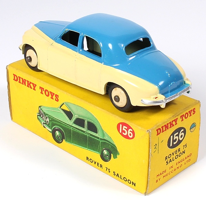 Dinky 156 Rover 75 Saloon. Mid-blue and cream. Large print baseplate. Very near mint/boxed.
