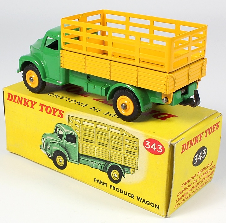 Dinky 343 Farm Produce Wagon. Very near mint/boxed. Scarce late issue with PLASTIC WHEELS in late picture box with green & yellow colour model pictured on both sides. From The 25 Year Collection.