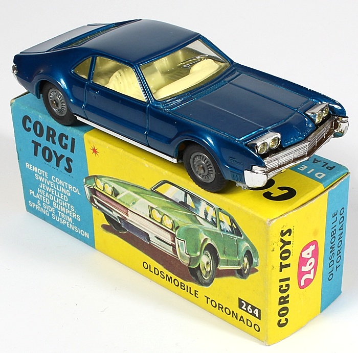 Corgi 264 Oldsmobile Toronado. Very near mint/boxed. Metallic Peacock Blue issue, cast wheels. Version WITHOUT tow hook. From The Berlin Collection.