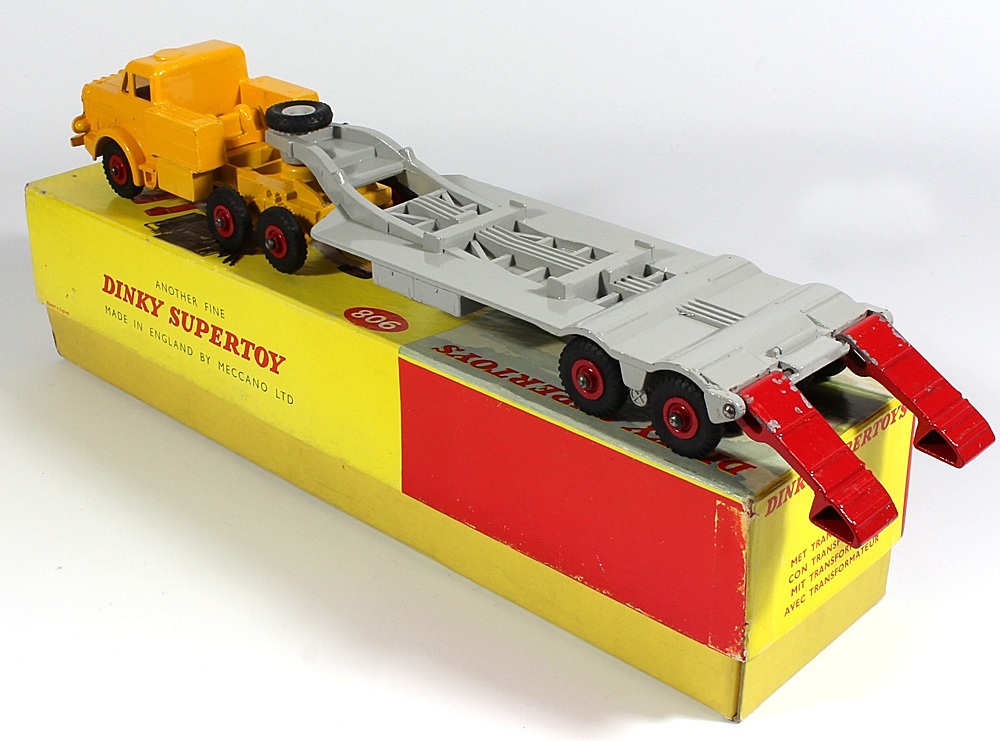 Issued between 1962-64. This model comprises a yellow Mighty Antar Tractor unit with a detachable grey trailer as well as the all-important (French Dinky 883) Transformer unit, assembled. Red wheels issue.