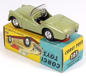 Corgi 305 Triumph TR3 Sports Car. Very near mint/boxed. Metallic olive green version with shaped spun wheels.